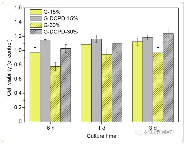 图11 MC3T3成骨细胞在G和G-DCPD支架的稀释浸提液中分别培养 6 h、1 d和3 d后的细胞活性