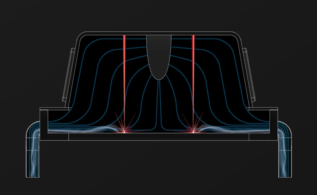 AMCM研发的AirSword系统突破了上述限制,公司新款M 8K打印机及规划中的M 10K等大型LPBF设备中,AirSword能产生覆盖整个打印空间的动态、多层气流。系统中央的气体发射器会沿腔室轴线将气流分为两股反向气流,将烟雾与飞溅物推向两侧的排气口。即便在长时间打印过程中,这一设计也能防止烟雾在腔室内扩散,避免其干扰激光束路径。