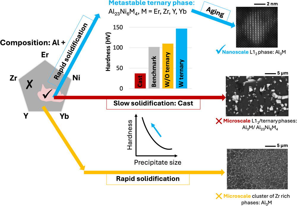 △合金设计概念展示了如何利用快速凝固和正确成分产生的亚微米级亚稳相将硬化相的长度尺度从微米级转变为纳米级。