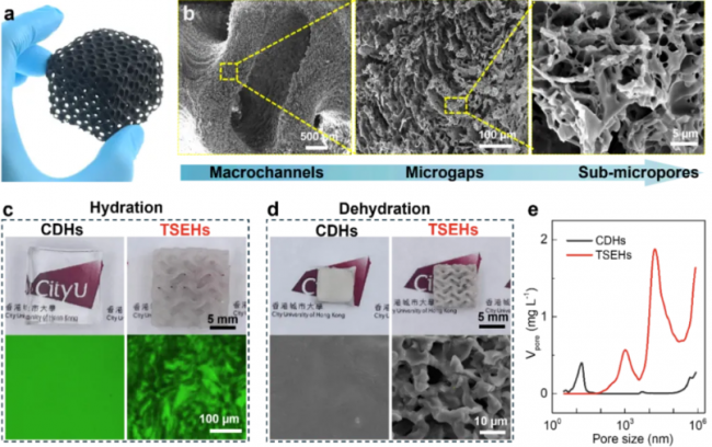 香港城市大学吕坚院士/华南理工大学綦戎辉教授合作,利用3D打印技术,制备了一种基于极小曲面(TPMS)结构的缠结水凝胶网(TSEHs),其具有分级多孔结构,有利于提高传质系数并形成显著的空气-吸湿位点界面。这种基于TPMS的分级结构赋予了TSEHs快速的吸附-解吸动力学。