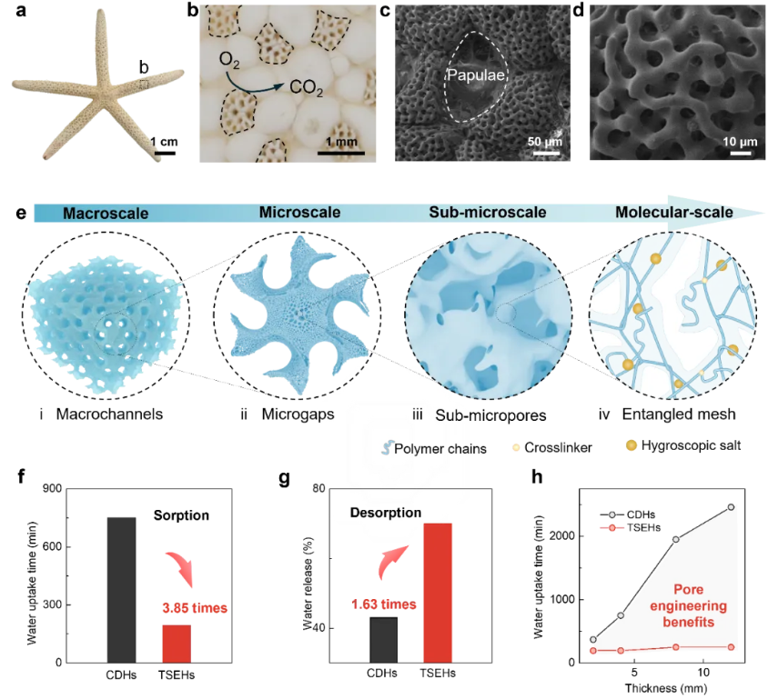图1. “孔工程”以增强AWH性能。 (a) 海星的光学图像。 (b) 胞状聚集体的放大图像。所选胞状区域在(a)中标记。 (c-d) 胞状及海星骨骼的扫描电镜图像。 (e) TSEHs的示意图。 CDHs和TSEHs的吸附时间(f)和水释放性能(在1个阳光下,30分钟)(g)的比较。 (h) CDHs和TSEHs的水吸收时间的厚度相关性。该孔工程水凝胶显著提高了空气取水表现,具有在催化、力学等方面应用拓展潜能。