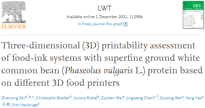 2021年12月1日,中国农业科学院作物科学研究所:Zhenxing Shi(1作)......、么杨*(通讯)等在农林科学1区TOP期刊LWT-Food Science and Technology (IF:4.952)在线发表了题为“Three-dimensional (3D) printability assessment of food-ink systems with superfine ground white common bean (Phaseolus vulgaris L.) protein based on different 3D food printers”的研究文章。